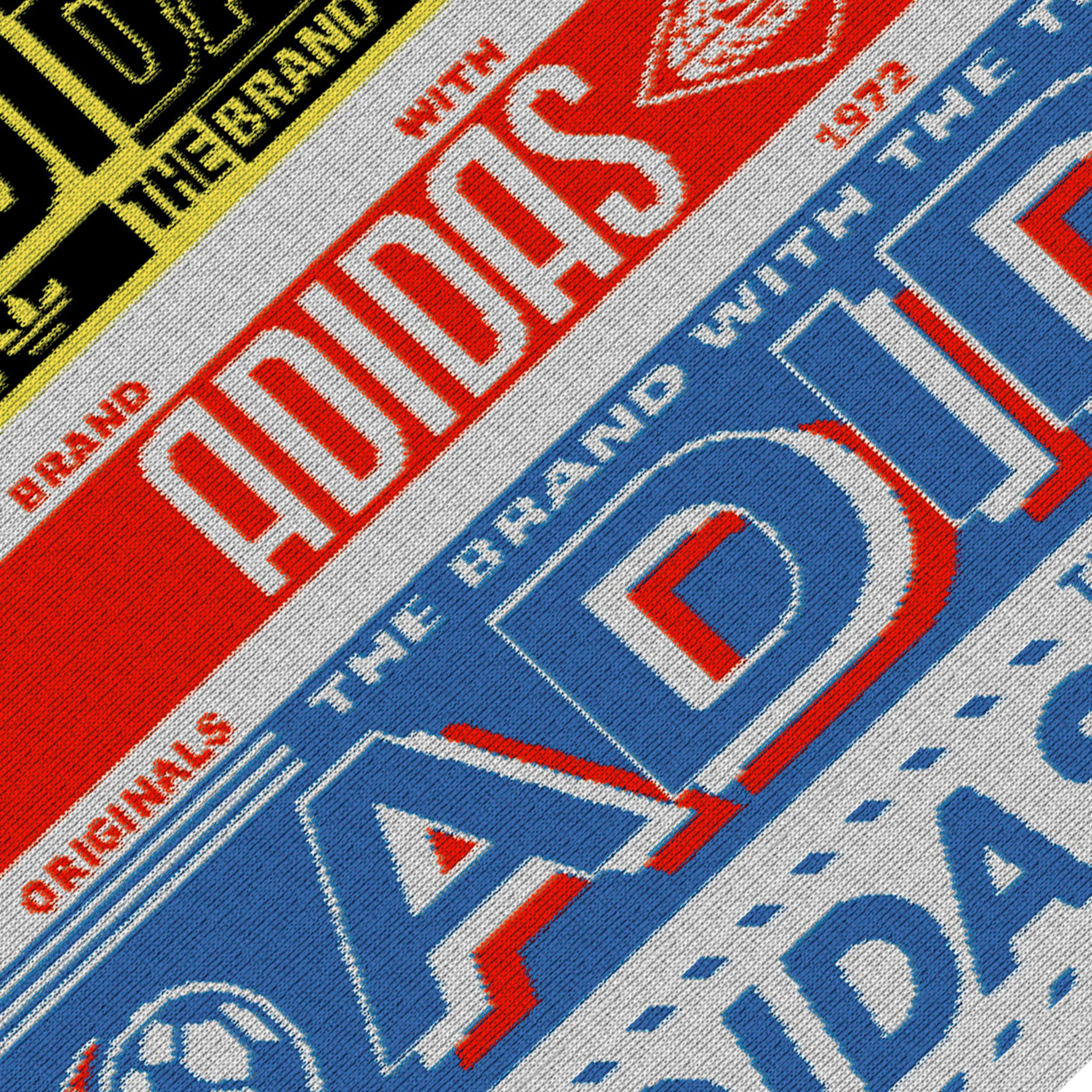 A unique piece of knitwear fabricated with a vibrant assembly of real scarves inspired by Football clubs all around the world. The adidas branding mixes here with the vibrancy of the stadium and its color-clashing “cheap” typography from the Soccer fan clubs. .